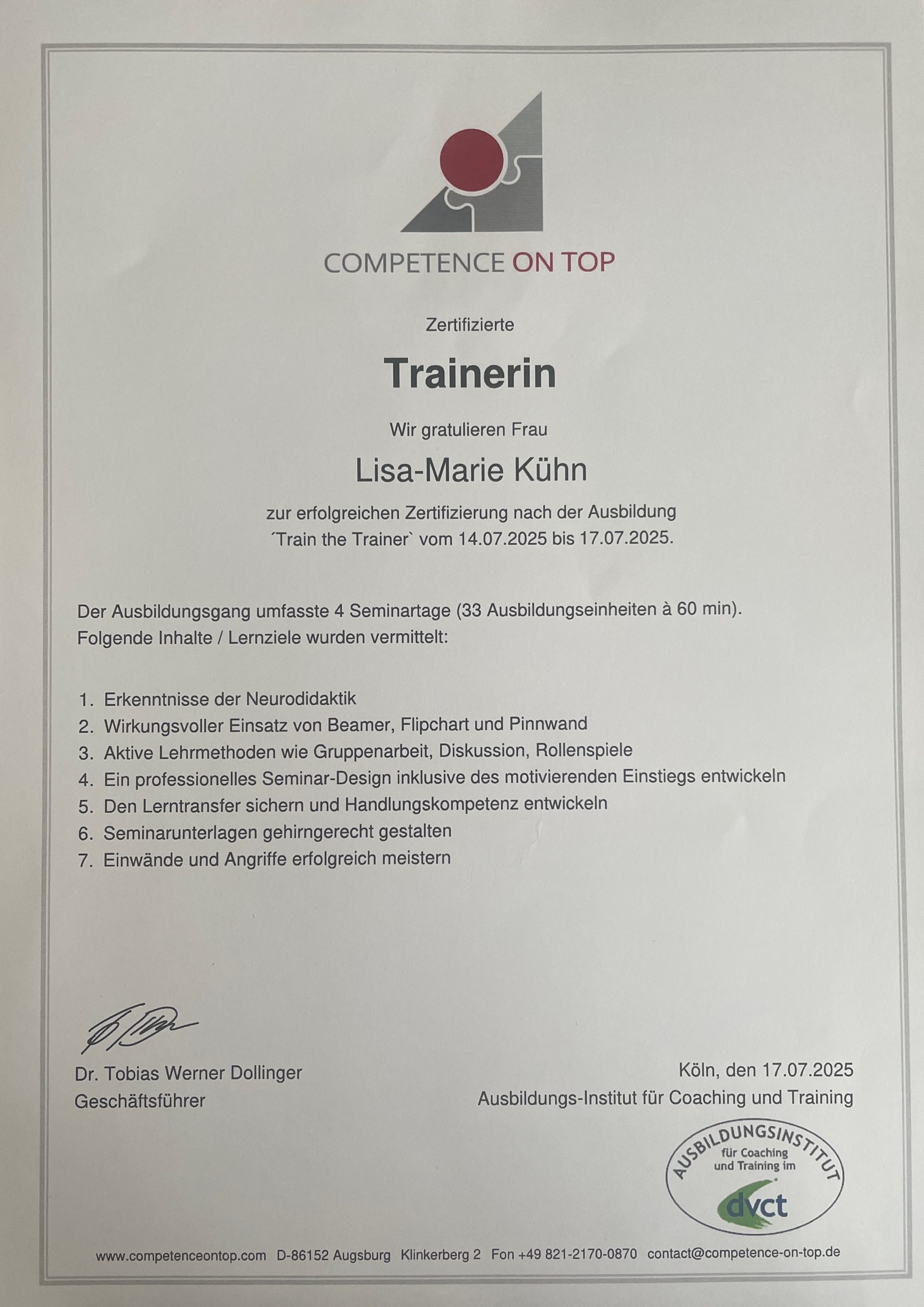 Offizielle Weiterbildung zur zertifizierten Trainerin durch ein 4-tägiges Training durch Competence on Top